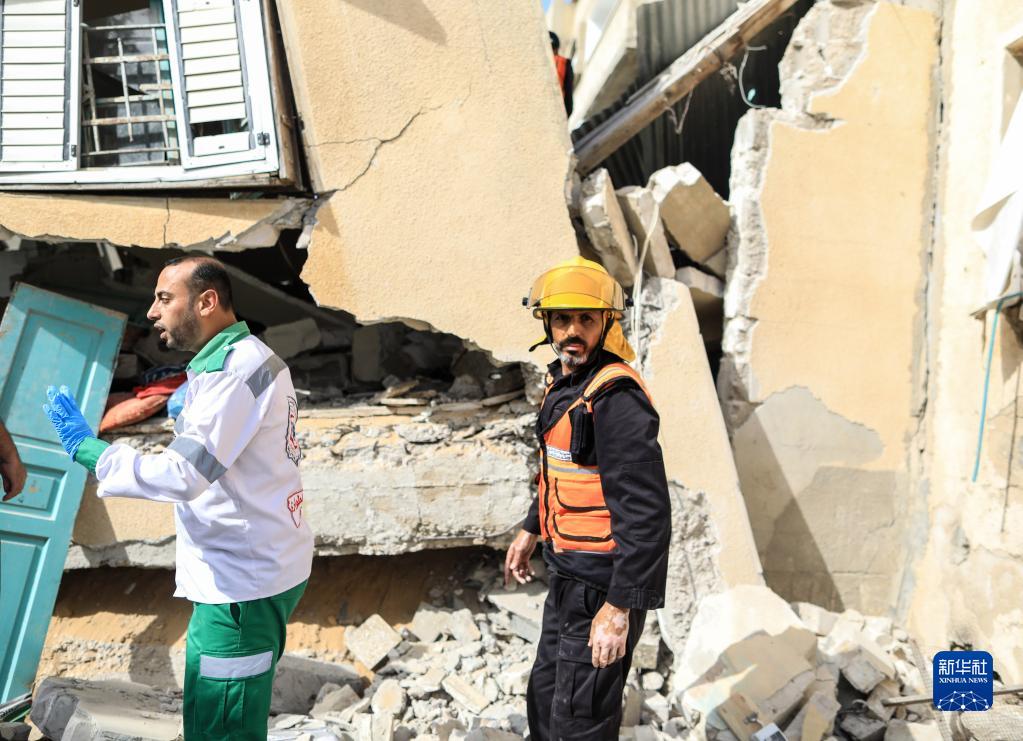 5月11日,在加沙地带汗尤尼斯,巴勒斯坦人查看空袭过后的建筑废墟。