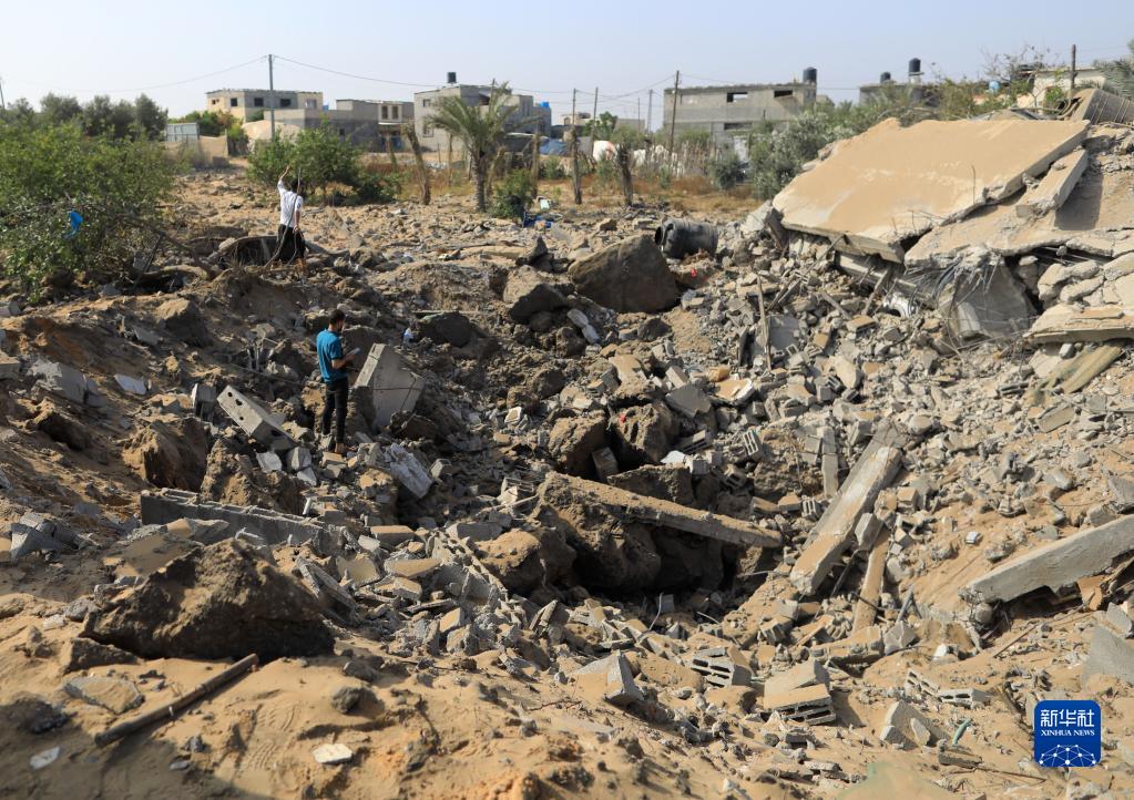 5月11日,在加沙地带汗尤尼斯,巴勒斯坦人查看空袭过后的建筑废墟。