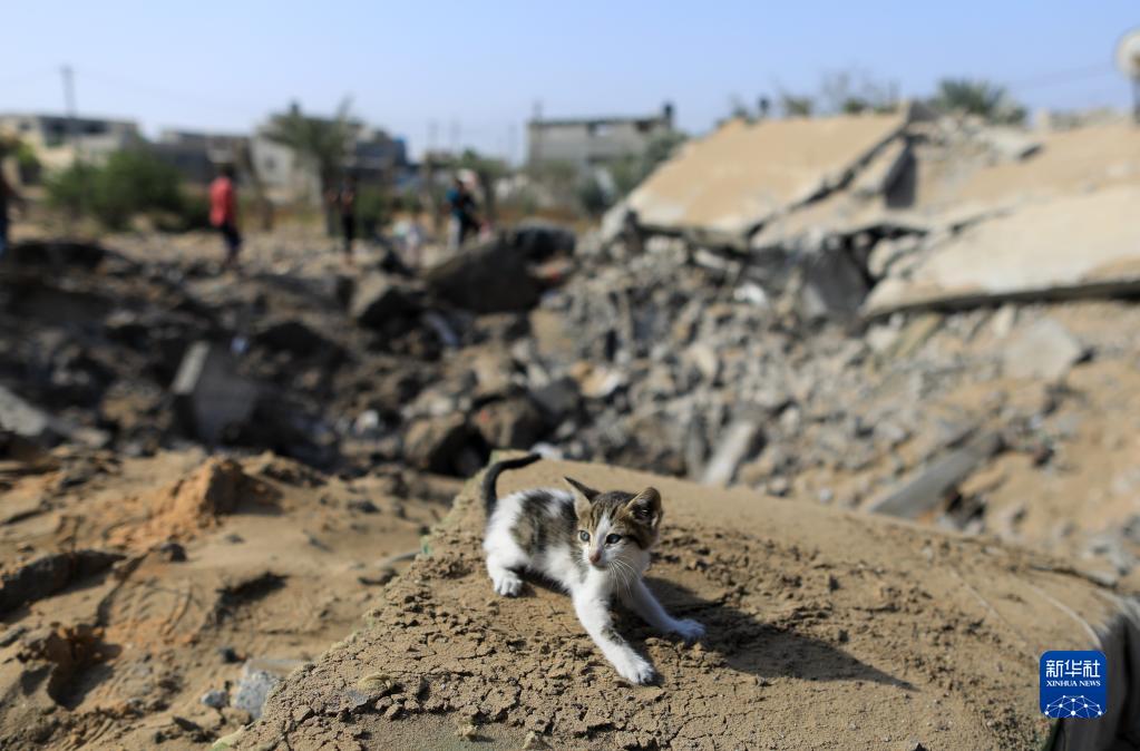 5月11日,在加沙地带汗尤尼斯,一只小猫趴在空袭过后的建筑废墟中。