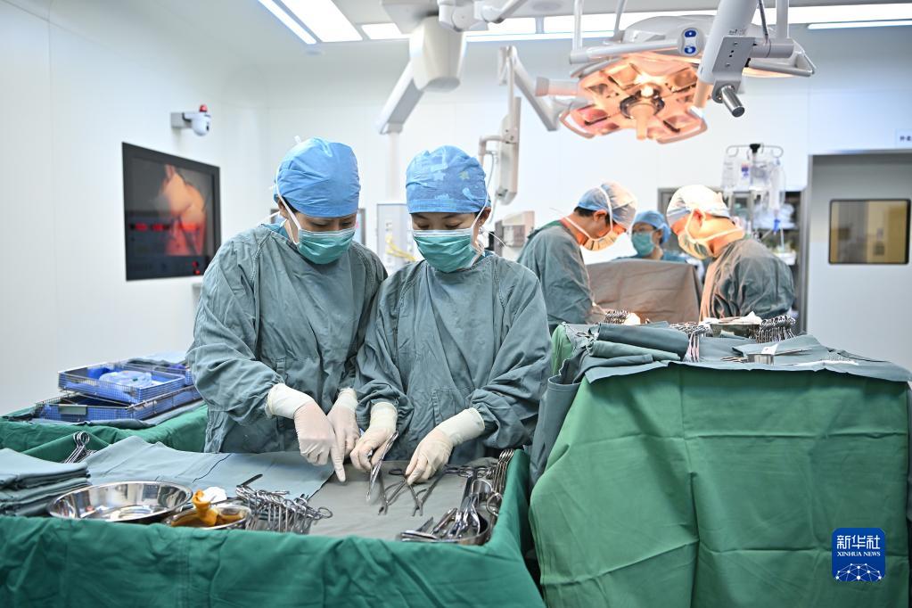 5月11日8时许,北京协和医院手术室护士张进军(前左)台上带教手术室年轻护士王璐(前右)。