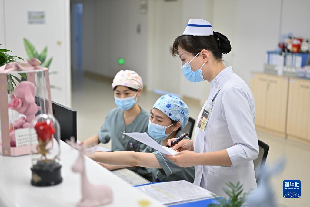 5月9日12时许,北京协和医院国际医疗部产科护士长郭羽(右)和同事核对医嘱。
