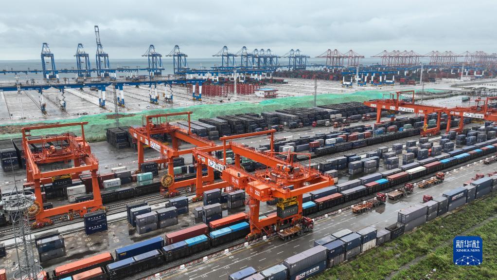在钦州港,自动化码头与广西钦州铁路集装箱中心站联动快速装卸转运集装箱(5月11日摄,无人机照片)。