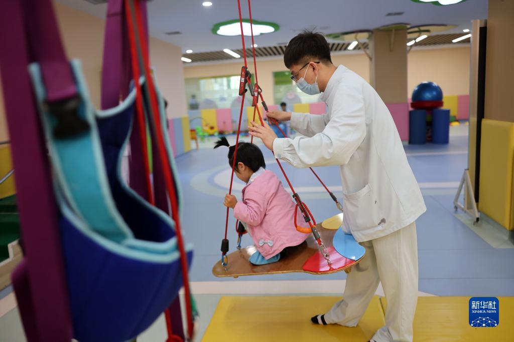 5月11日,康复治疗师在渭南脑病康复医院帮助患儿进行蹲位平衡训练。
