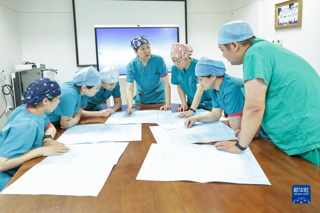 5月9日20时许,北京协和医院手术室执行总护士长王惠珍(中)在会议室开会,讨论内科楼手术室改造图纸布局。