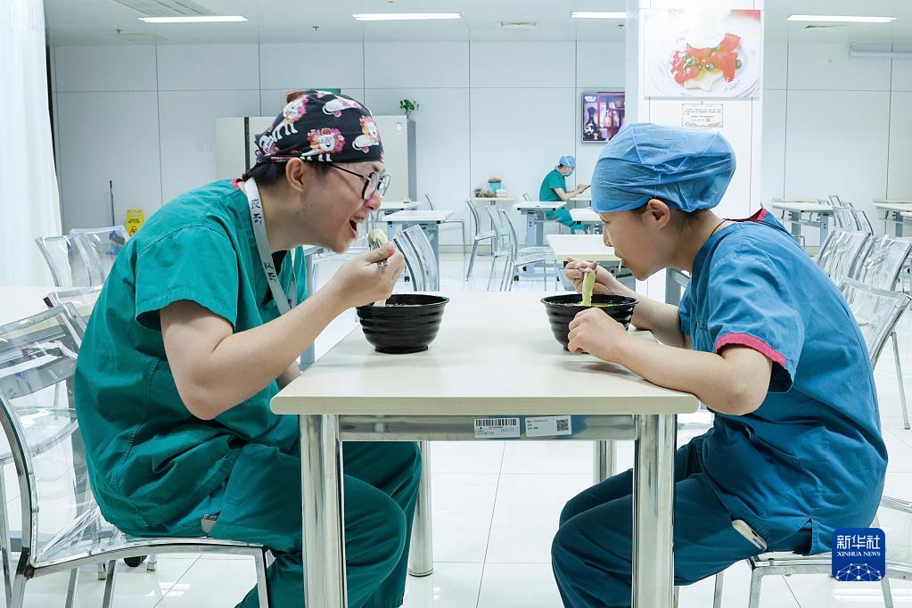 5月9日20时许,北京协和医院,刚刚下班的手术室护士冯翮飞(左)和周航在手术室餐厅内用餐交流。