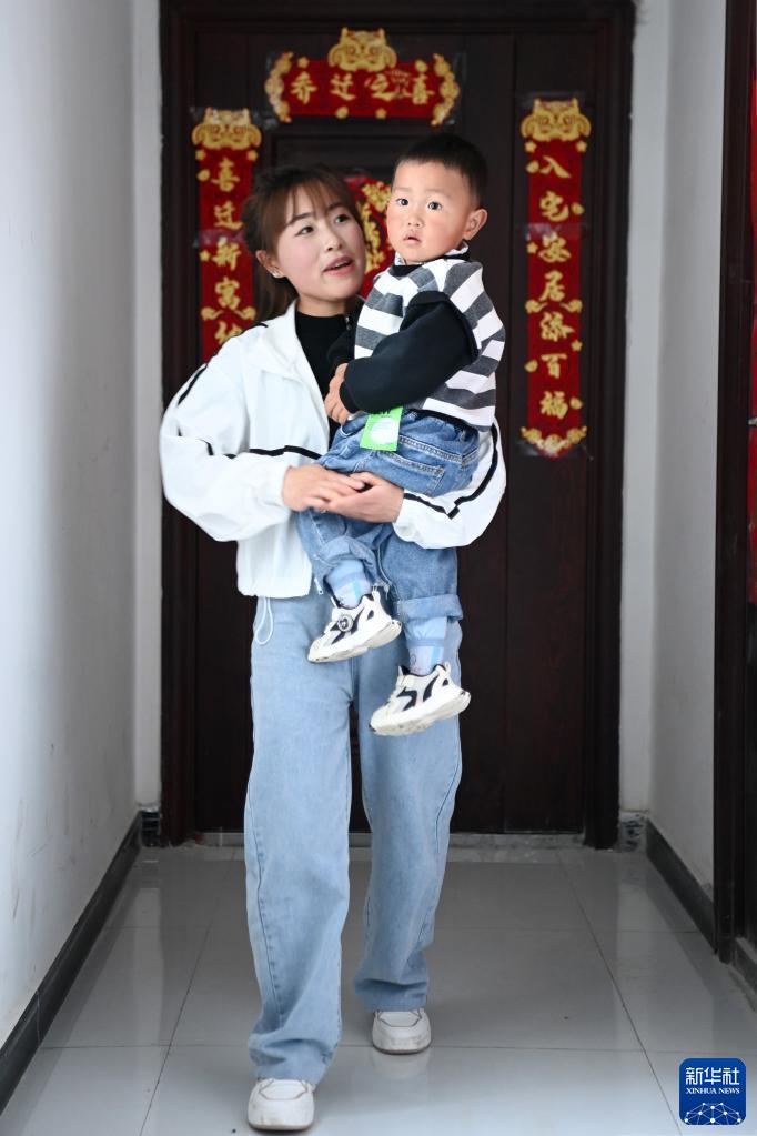 5月10日,在甘肃省陇南市武都区两水镇安置点,搬迁群众张平花抱着孩子走出新家。