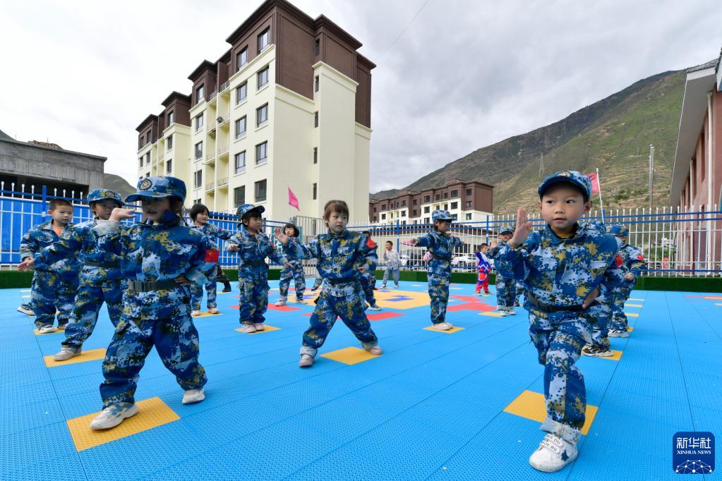 5月9日,在甘肃省陇南市宕昌县沙湾镇生态及地质灾害避险搬迁安置房旁的新起点幼儿园,孩子们在户外上课。