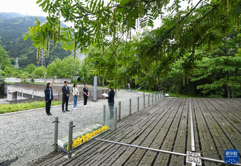 5月8日,钟朝辉(左二)和曲海望(左三)在“5·12”汶川特大地震映秀震中纪念馆外聆听邱光华机组英雄事迹微党课。
