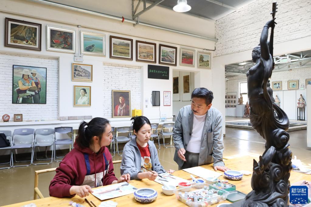 5月11日,敦煌彩塑制作技艺非物质文化遗产传承人杜永卫(右)在位于敦煌市的莫高里工匠村给学员教授绘画技法。