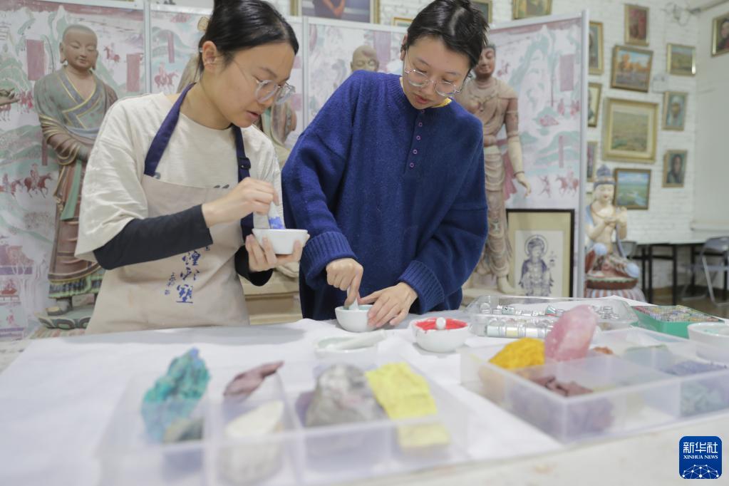 5月11日,学员在位于敦煌市的莫高里工匠村用天然矿石制作颜料。