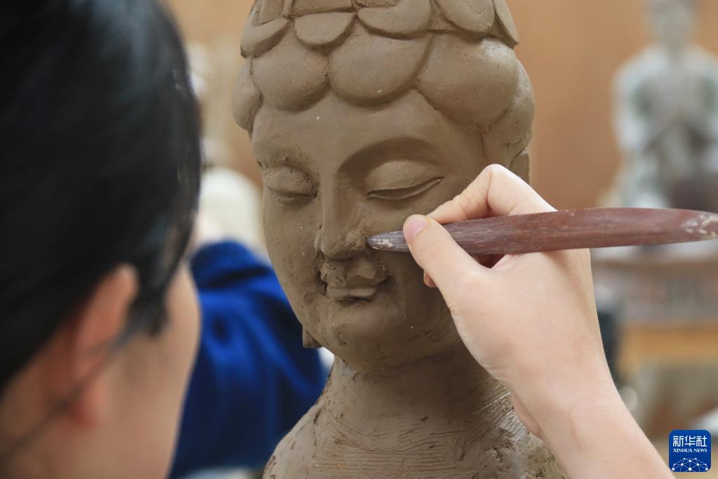 5月11日,学员在位于敦煌市的莫高里工匠村练习雕塑技艺。