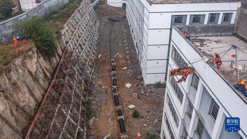 六盘水消防救援支队队员在进行模拟高山峡谷救援演练(5月11日摄,无人机照片)。