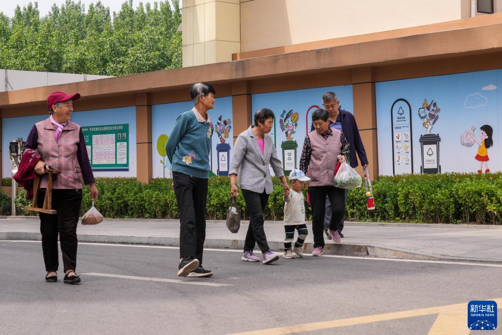 5月12日,北汝村居民在环境整洁的安置小区内散步。