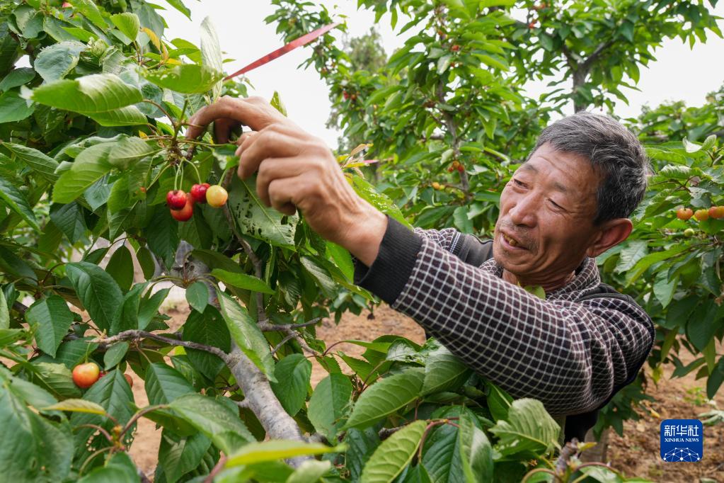 5月12日,五峰山街道西石村党员董德常在自家党员种植示范园内查看新品种樱桃生长情况。