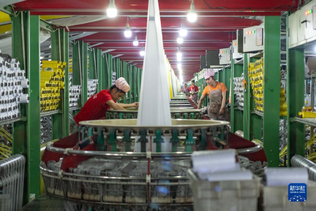 5月12日,黑龙江省穆棱市一家亚麻纺织企业的工人在进行生产作业。