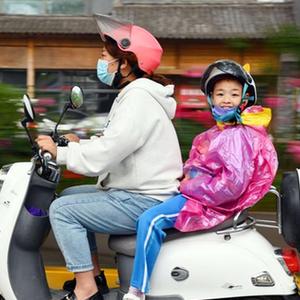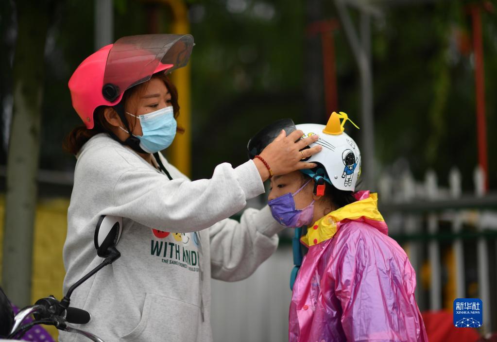 5月9日,在陕西省渭南市特殊教育学校,王鸽在放学后为女儿赵懿菲戴上头盔。