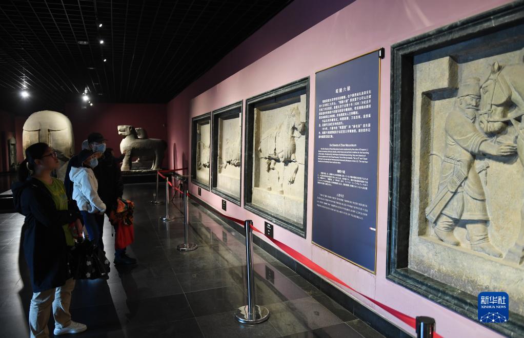 5月9日,游客在西安碑林博物馆内参观昭陵六骏石雕。唐昭陵六骏石刻是为纪念六匹随唐太宗李世民征战疆场的战马而刻制的,其中特勤骠等马匹带有明显的西域良马特征。