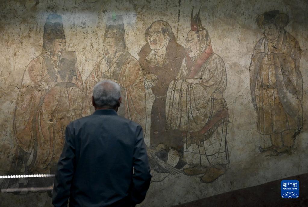 5月11日,游客在陕西历史博物馆内观看唐章怀太子墓《客使图》。《客使图》描绘的是唐代外交机构鸿胪寺官员接待外国使节的场景。