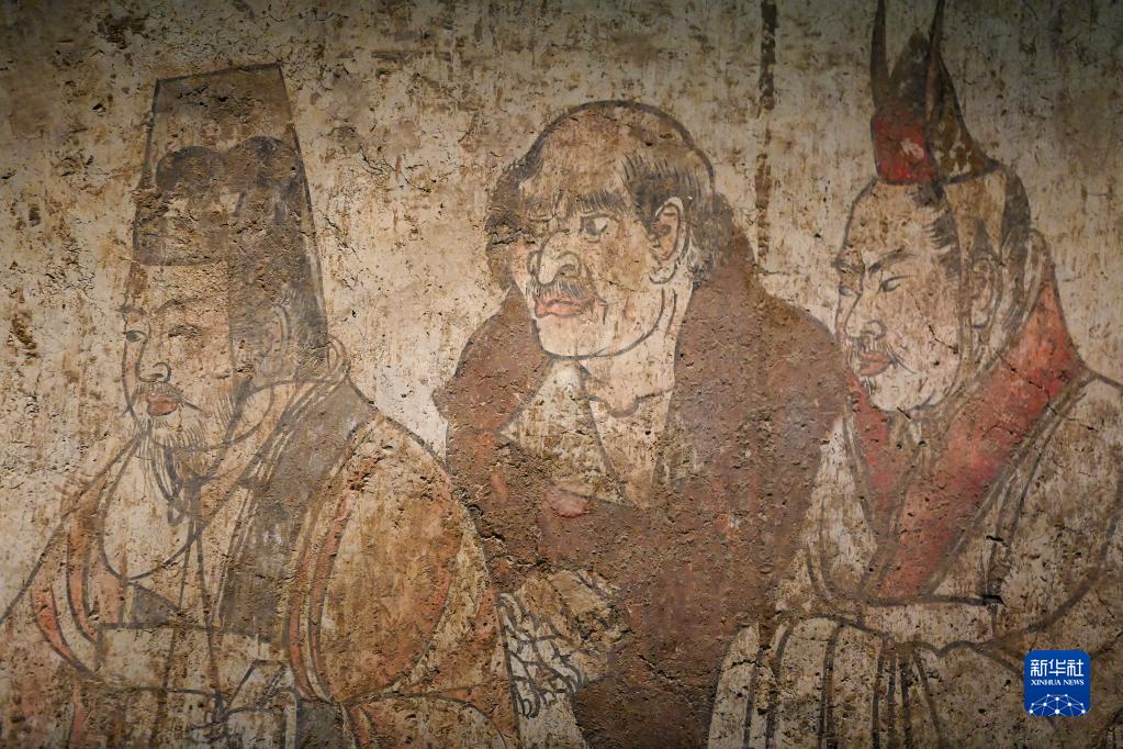 这是在陕西历史博物馆拍摄的唐章怀太子墓《客使图》(局部)(5月11日摄)。《客使图》描绘的是唐代外交机构鸿胪寺官员接待外国使节的场景。