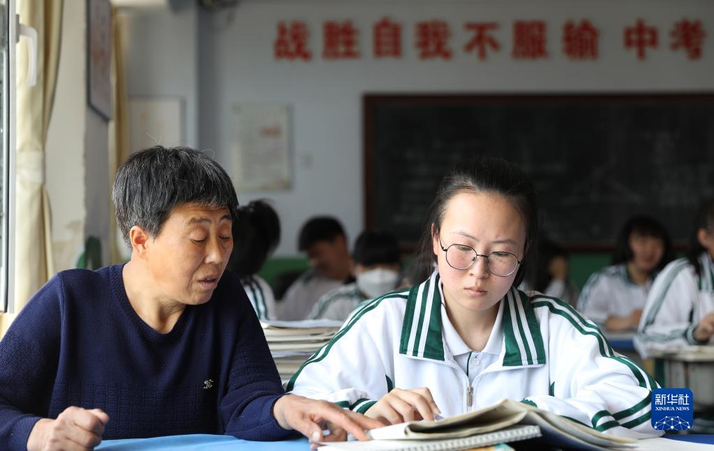 张连琴(左)和女儿李昕伟在教室内听课(5月8日摄)。