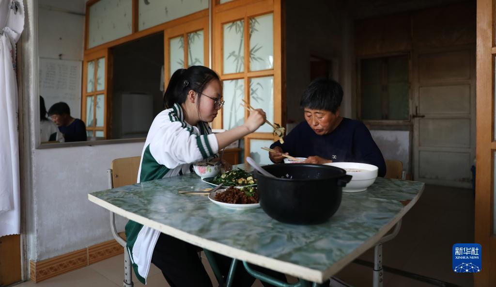 晚餐中的李昕伟为妈妈夹菜(5月7日摄)。