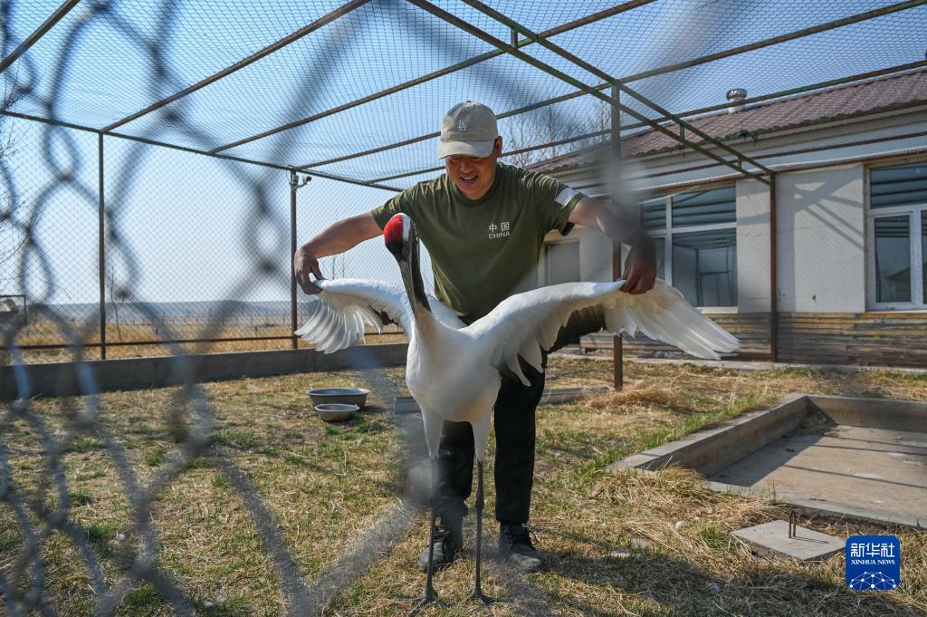 5月10日,徐沃德乐胡帮助一只救助的丹顶鹤张开翅膀。