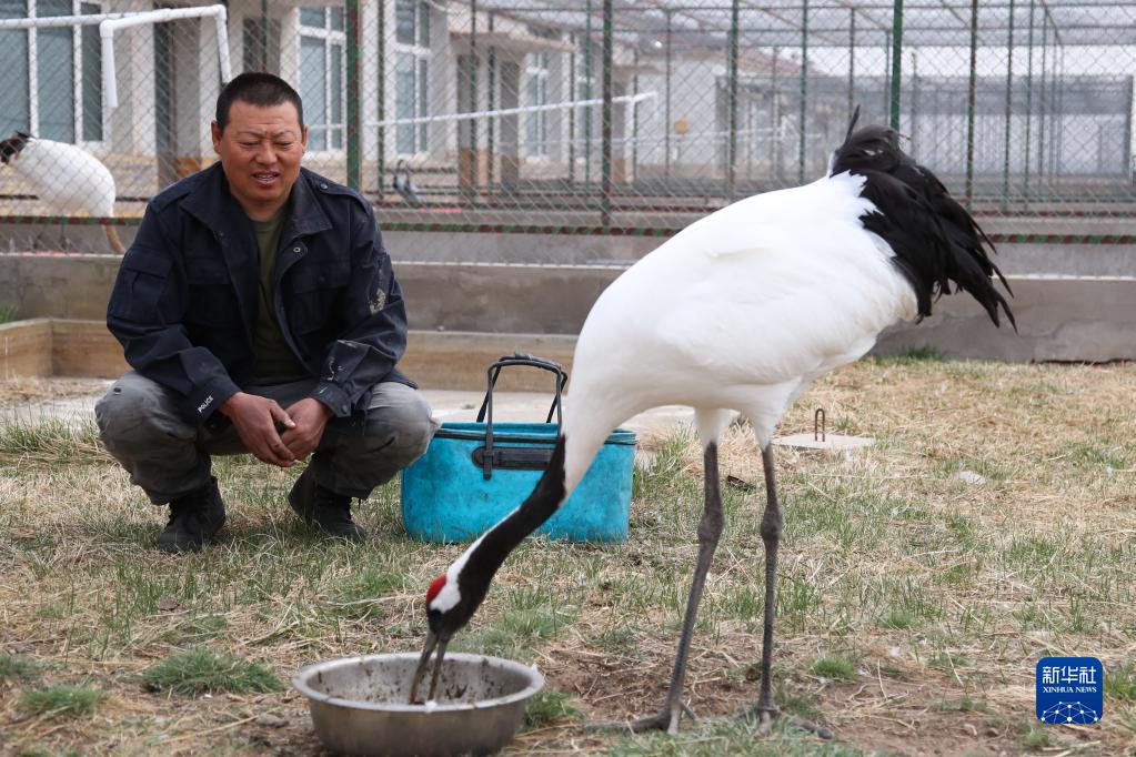 5月11日,徐沃德乐胡在观察救助的丹顶鹤进食。