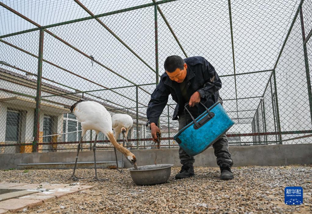 5月11日,徐沃德乐胡给救助的丹顶鹤喂食。