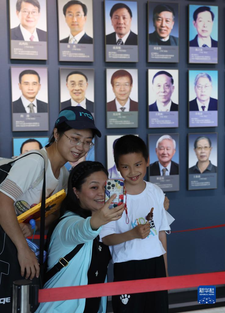 5月13日,参观者在中科院物理研究所院士墙前留影。