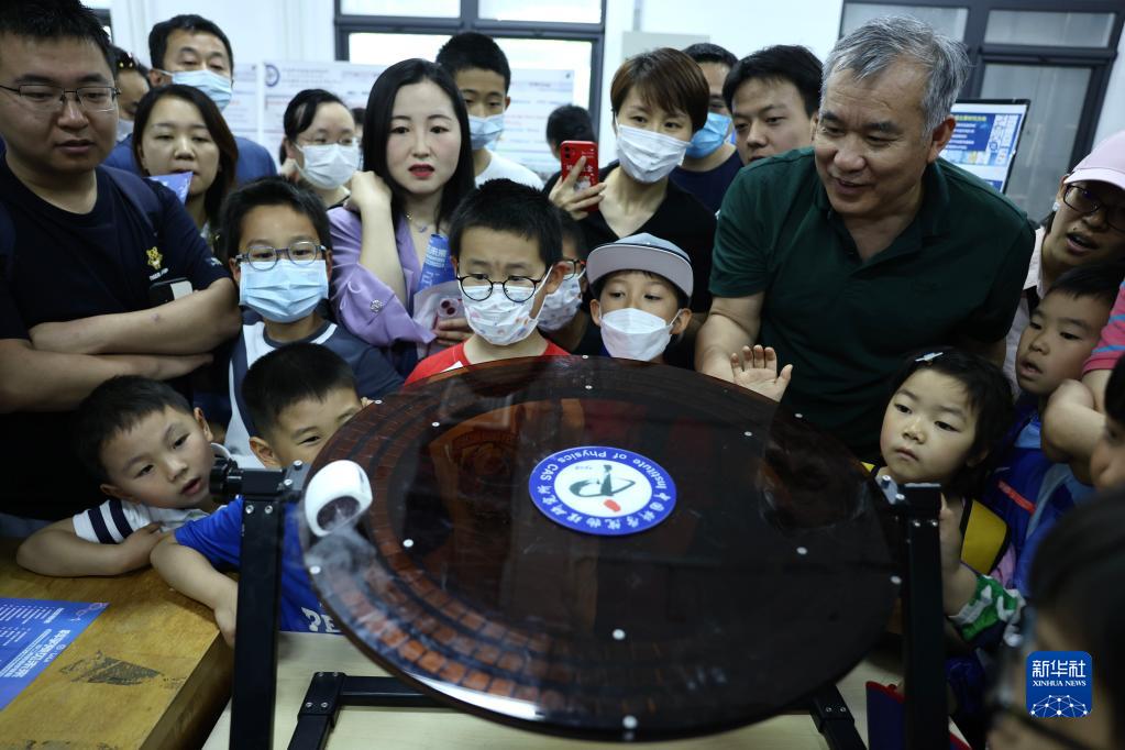5月13日,在中科院物理研究所超导国家重点实验室,曹则贤研究员(右)在向参观者介绍低温超导实验。