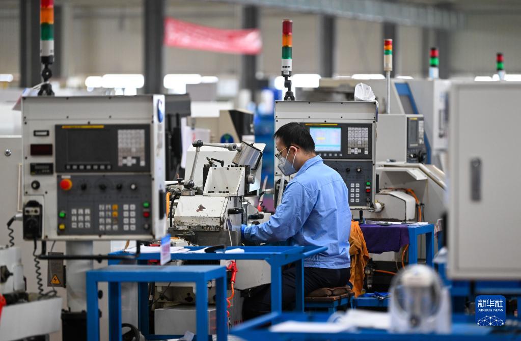5月11日,在航天精工股份有限公司,工人操作设备加工航空航天类部件产品。