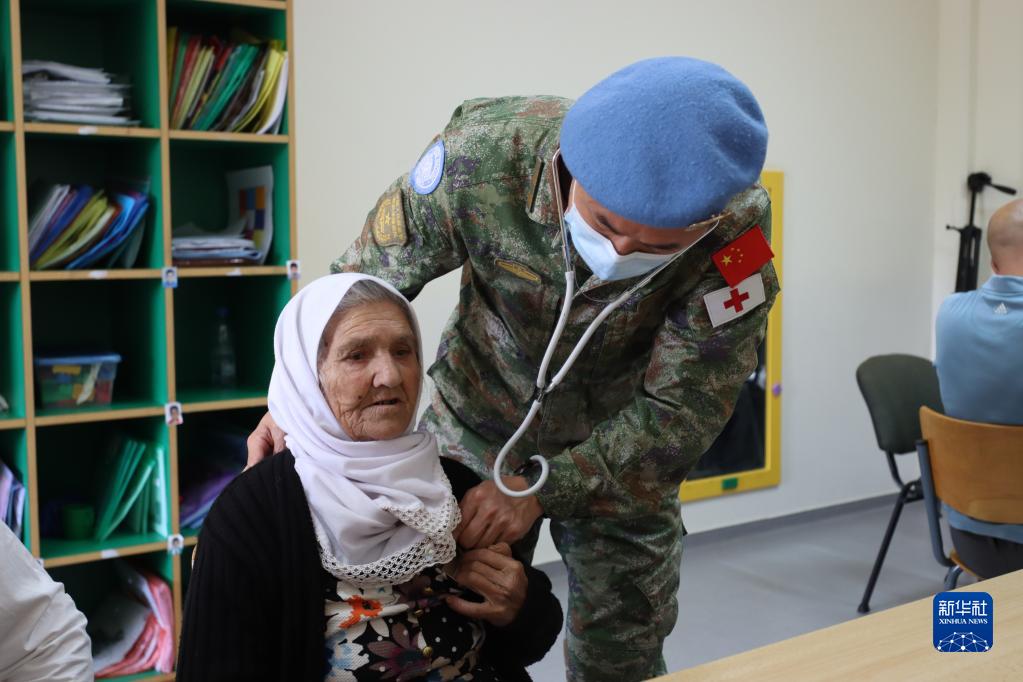5月12日,在黎巴嫩阿尔库卜关爱与发展中心,参加义诊活动的中国第21批赴黎巴嫩维和医疗分队内科医师郑喜源为病人查体。