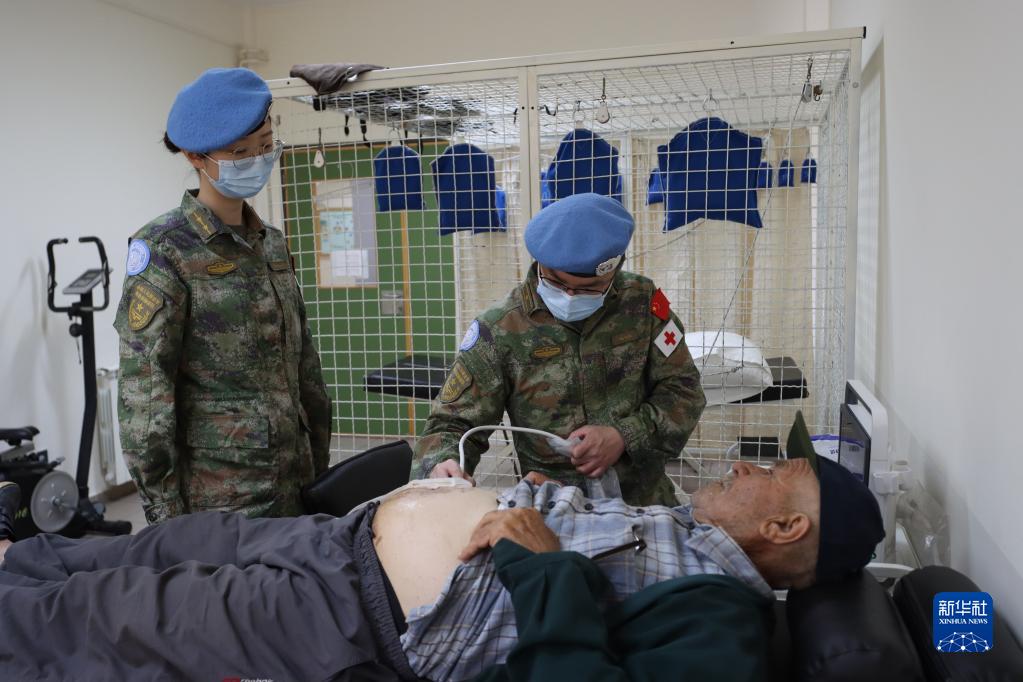 5月12日,在黎巴嫩阿尔库卜关爱与发展中心,参加义诊活动的中国第21批赴黎巴嫩维和医疗分队特诊医师喻智(后右)为病人做检查。