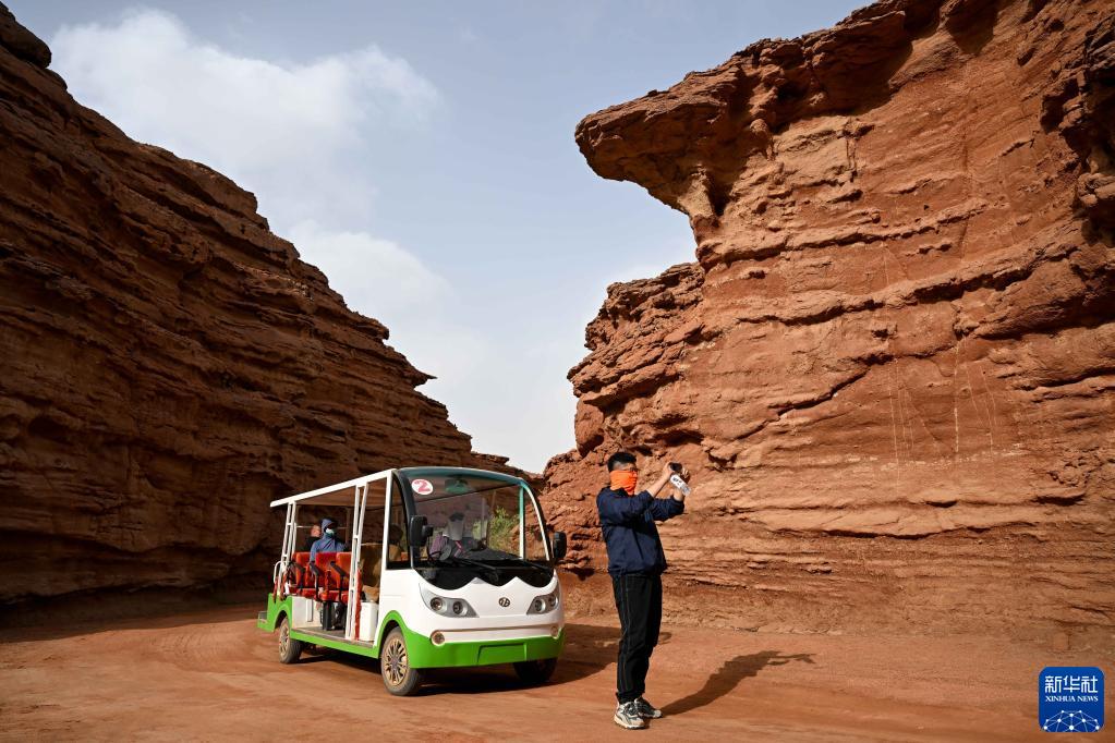 5月13日,游客在内蒙古阿拉善盟阿拉善左旗西部梦幻峡谷景区参观拍照。