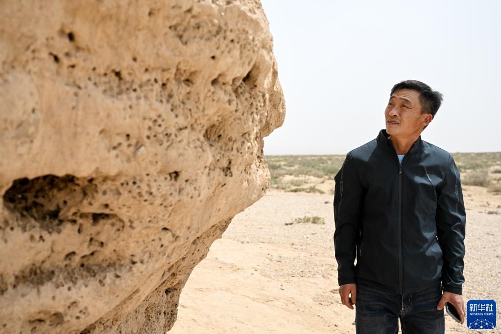 5月13日,驼峰(长城)文物保护队员布音乌力吉在观察阿拉善左旗一处烽火台遗址表面,查看是否有人为破坏痕迹。