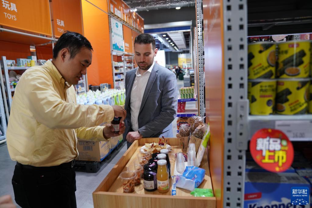 5月13日,在虹桥品汇进博畅购集,工作人员向消费者展示商品。