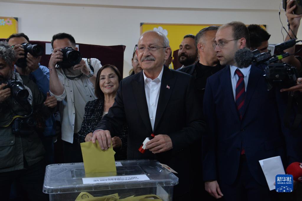 5月14日,在土耳其安卡拉,由6个反对党组成的“民族联盟”阵营候选人凯末尔·克勒奇达尔奥卢(中)在一处投票站投票。