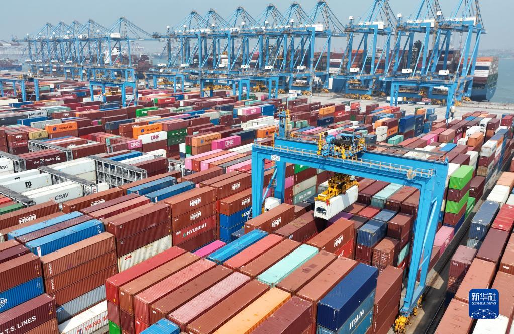 山东港口青岛港全自动化码头进行装卸作业(5月14日摄,无人机照片)。