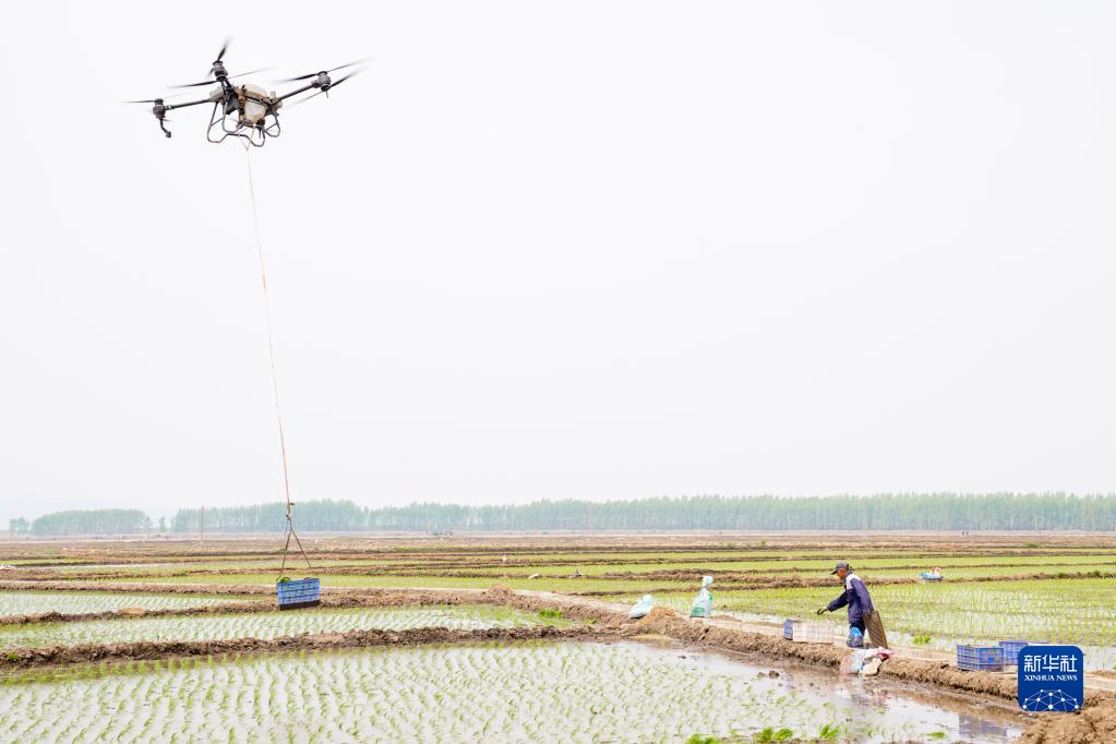 5月15日,在永吉县万昌镇禾谷丰水稻种植农民专业合作社,无人机在运送水稻秧苗。