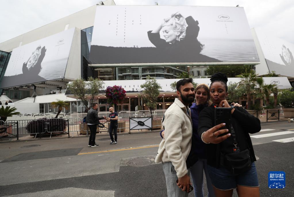 5月15日,在法国南部海滨城市戛纳,人们在电影宫外的戛纳国际电影节海报前自拍。