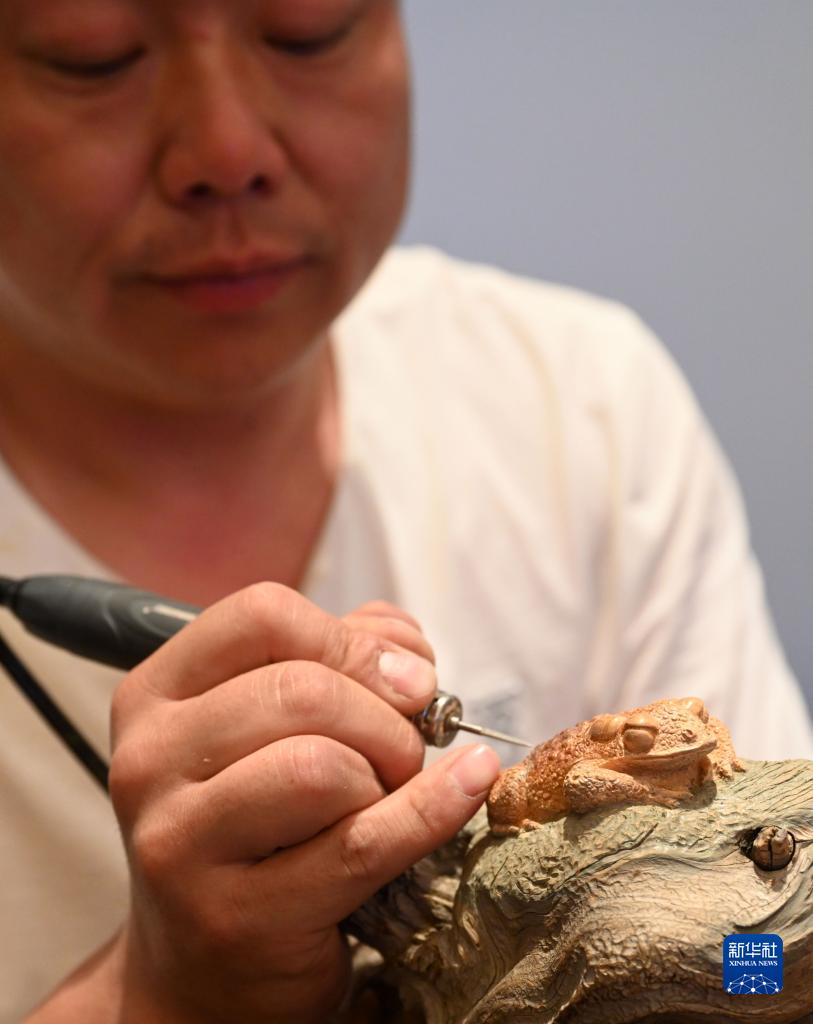 5月16日,民间艺人冀艳利展示根雕技艺。