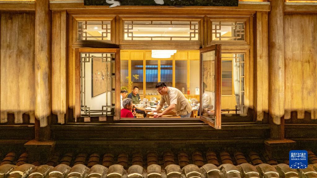初夏时节,山东省青岛市的即墨古城里灯火通明,古色古香的建筑与流光溢彩的灯光吸引了不少游客前来游览、购物,热闹的夜间消费让城市持续焕发活力。