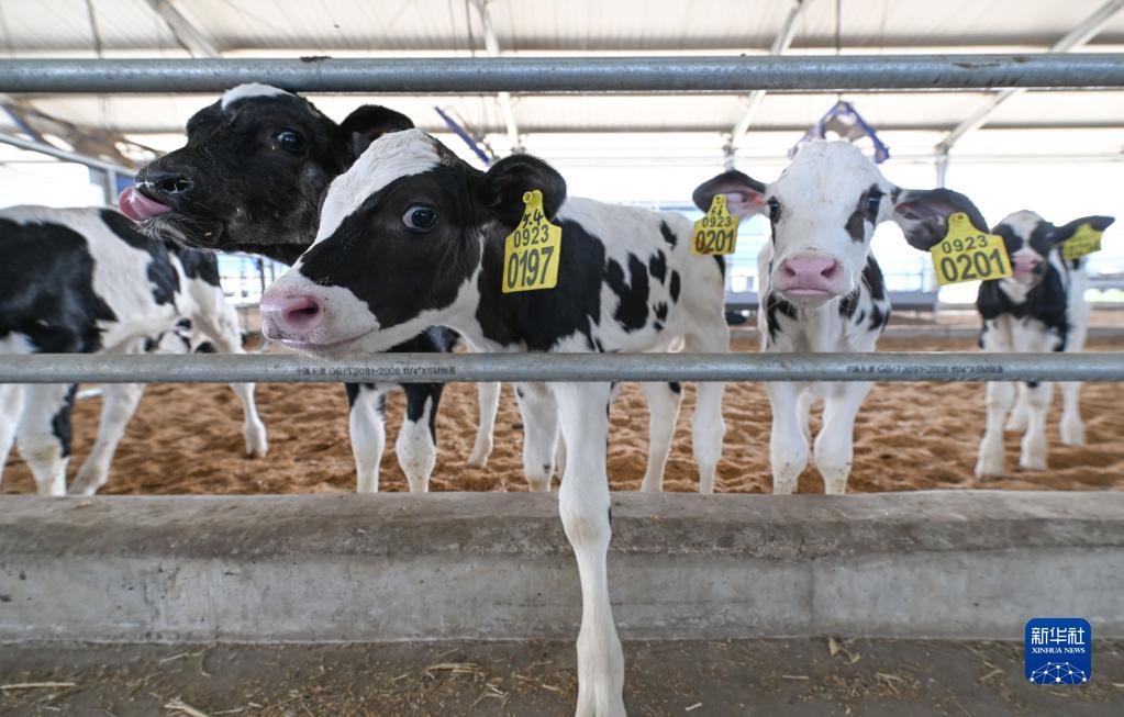 在天津天食智慧牧场牛舍内,工作人员为每只新生奶牛添加电子耳标,记录健康、产奶等信息(5月15日摄)。
