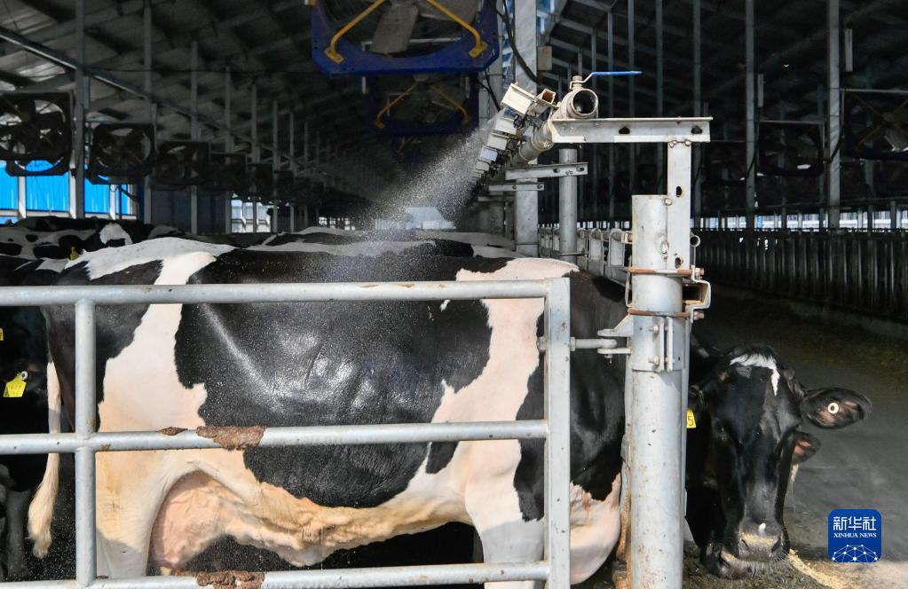5月15日,在天津天食智慧牧场牛舍内,传感器根据温湿度数据,启动自动喷淋设施降温。