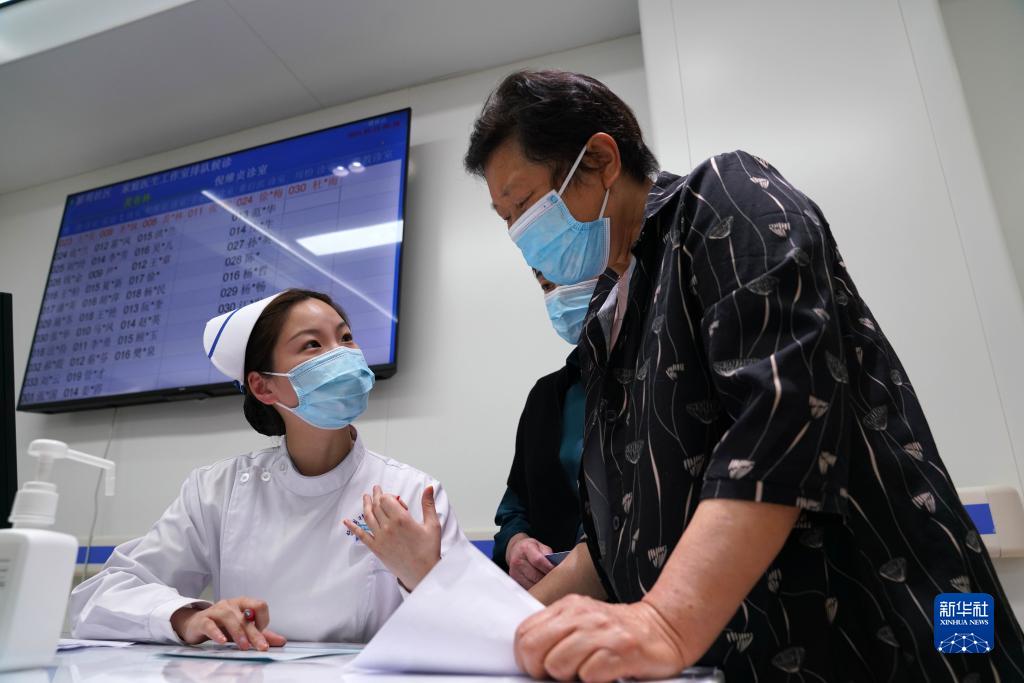 5月16日,在江苏省镇江市润州区黎明社区卫生服务中心家庭医生工作室,护士解答患者问题。