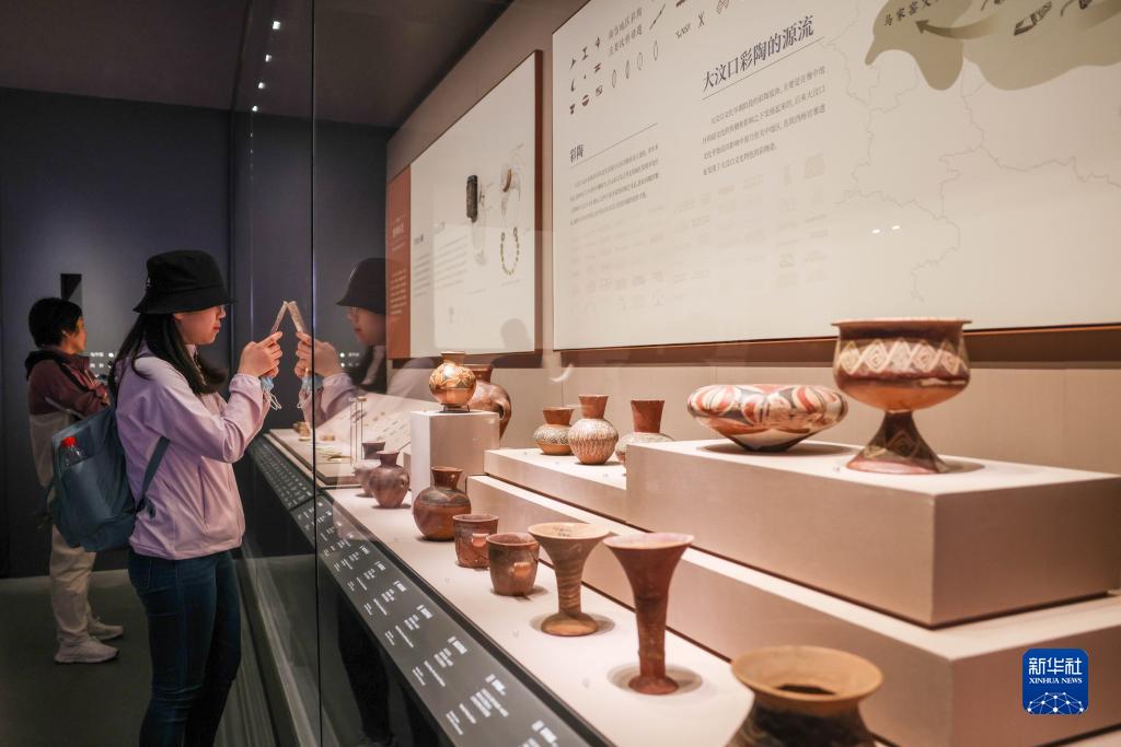 5月16日,观众在参观“海岱日新——山东历史文化展”展出的史前时期陶器。
