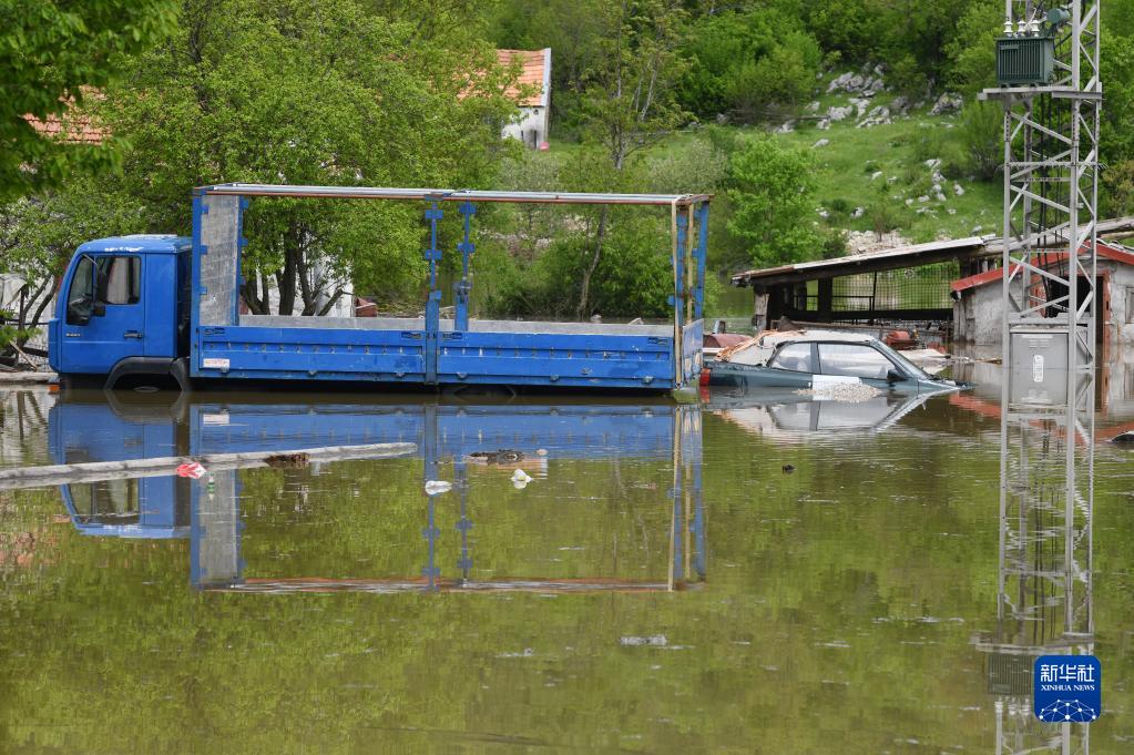 这是5月15日在克罗地亚格拉查茨拍摄的浸泡在洪水中的车辆。