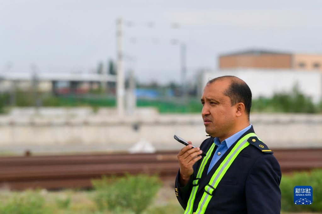 5月14日,在霍尔果斯铁路口岸,海米提·吐尔汗通过手机了解工作进展。
