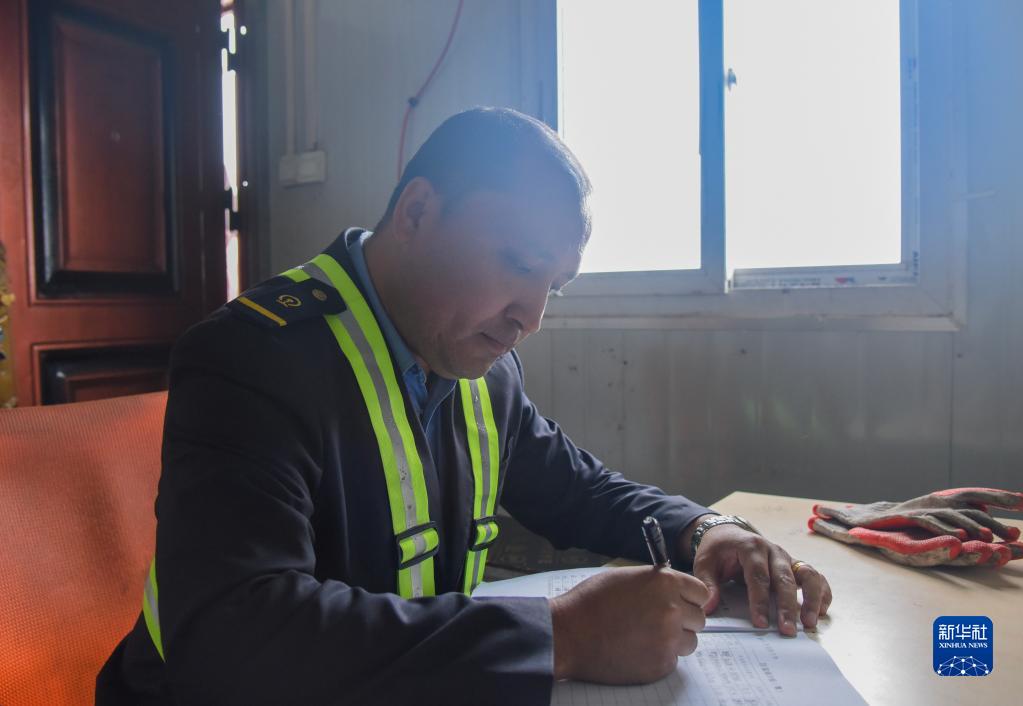 5月14日,在霍尔果斯铁路口岸,海米提·吐尔汗在填写工作记录。