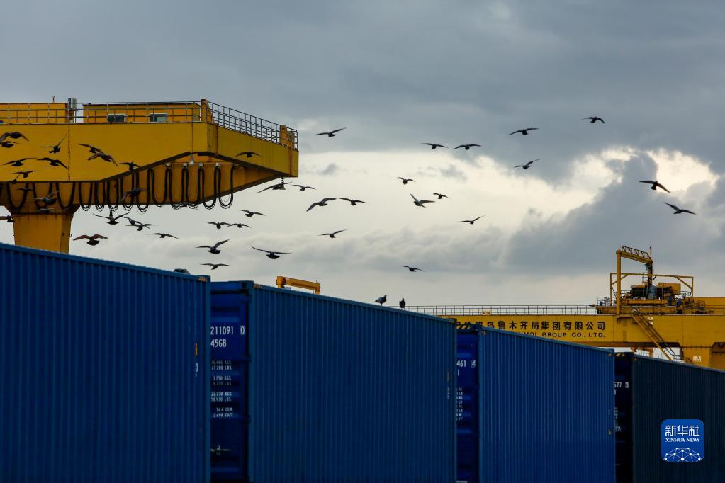 5月14日,在霍尔果斯铁路口岸,一场大风阵雨过后,龙门吊开始作业。